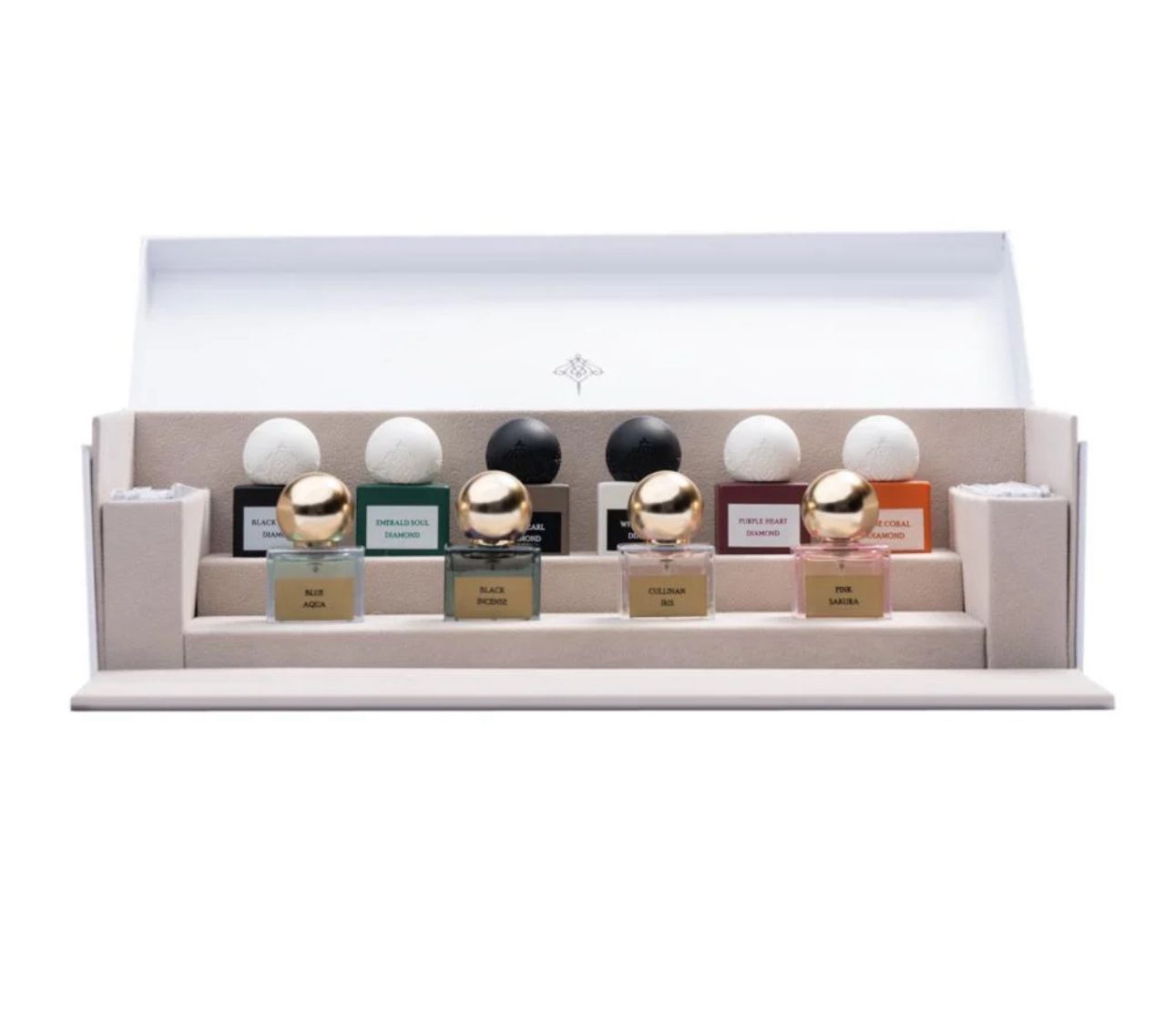 Une boîte luxueuse au design élégant qui comprend la collection Diamond complète dans une petite taille (10×10 ml), conçue avec une doublure en velours doux à l'intérieur, ajoutant une touche sophistiquée et luxueuse à l'expérience.